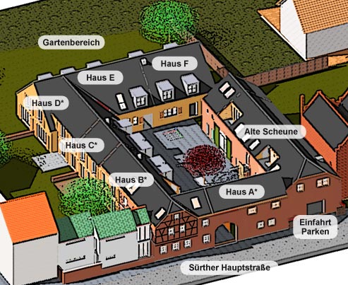 Die historische Bausubstanz wird saniert und um fünf neue Einfamilienhäuser ergänzt, die über eigene Gärten verfügen. Alle Häuser gruppieren sich um einen autofreien Innenhof, der über den alten Tordurchgang an der Sürther Hauptstraße zugängig ist.